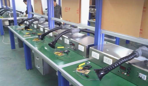 | 外排和室內(nèi)凈化簡述: (1):外排方式: 整體布管根據(jù)實際情況使用不同的風(fēng)機,通過分次布管接到各個焊錫工位,通常主管直徑在30CM左右,分到次管直徑為5CM到10CM之間,前面也需要加上喇叭口之類的吸煙罩以達到更好的吸煙效果,風(fēng)機功率在7.5千瓦左右。一個7.5千瓦風(fēng)機能帶上20個左右焊錫工位![煙霧凈化器] (2):通過煙霧凈化設(shè)備凈化后直接在室內(nèi)排放: 采用煙霧凈化設(shè)備直接將煙霧廢氣完整的吸過來,經(jīng)過凈化處理達室內(nèi)空氣質(zhì)量標(biāo)準(zhǔn),可直接在室內(nèi)排放。