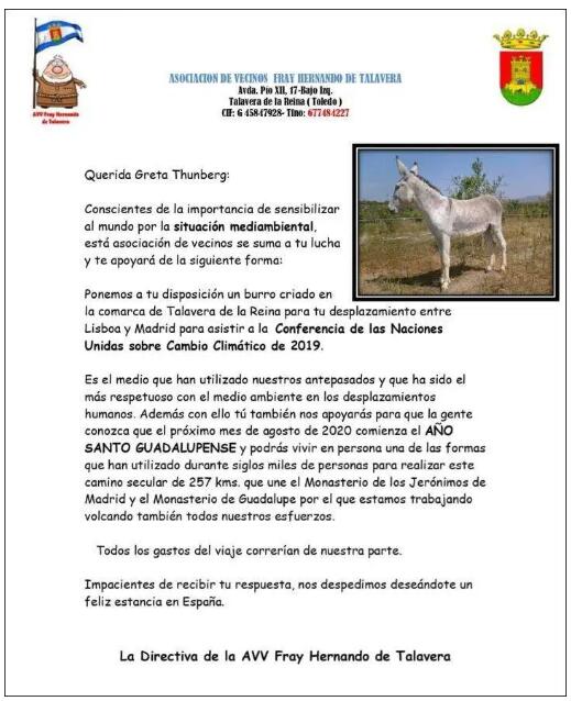 事情是這樣的,最近一段時間,西班牙首都馬德里正在召開聯合國氣候變化大會,該協會在社交平臺上公開表示,要向與會人員之一的格蕾塔贊助一頭驢,以作為她從里斯本前往馬德里參加聯合國氣候變化大會最環保的交通工具。